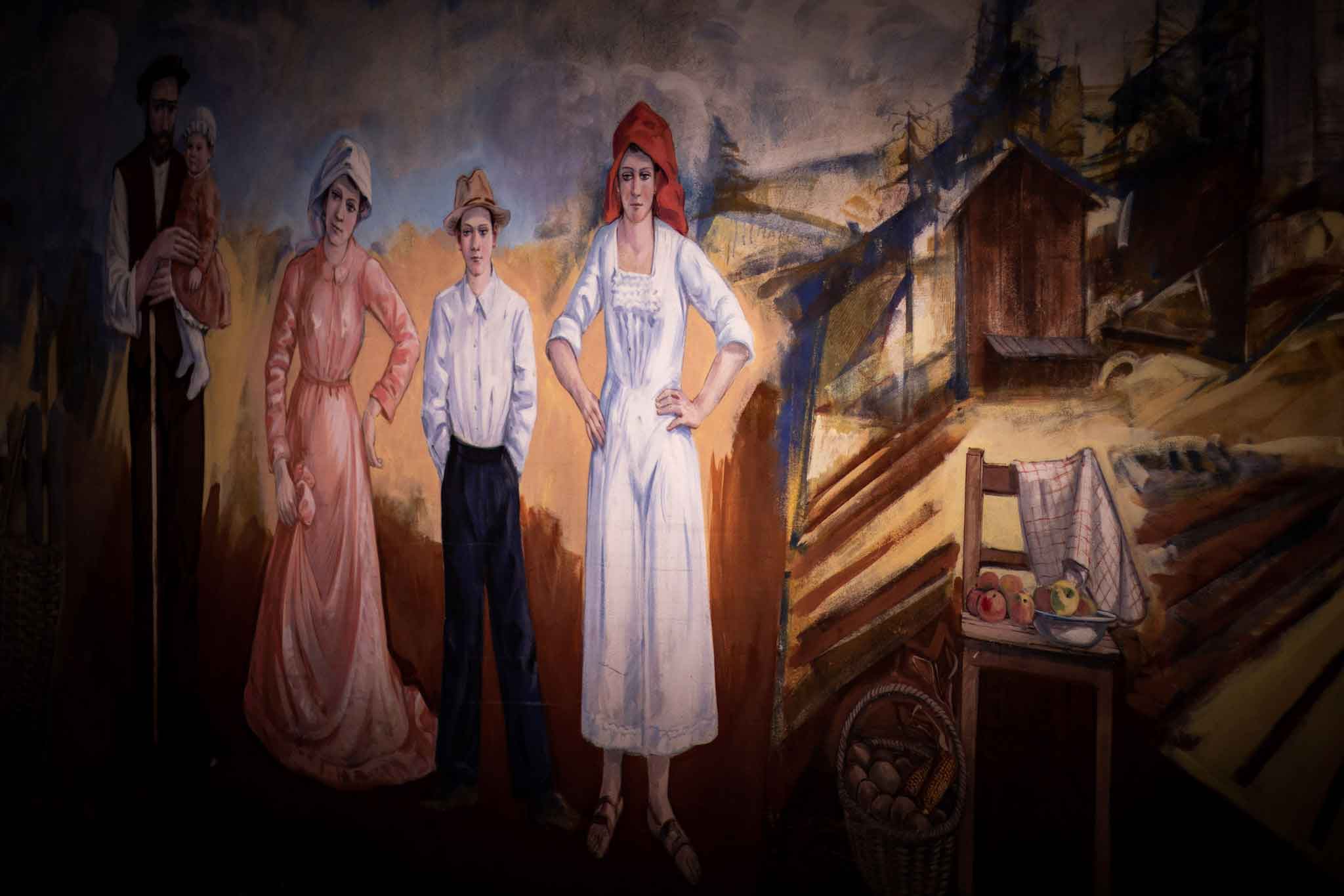 In questo murale Miraldo Beghini ci presenta la famiglia di contadini di Vettor de Mosè, durante una giornata di festa.