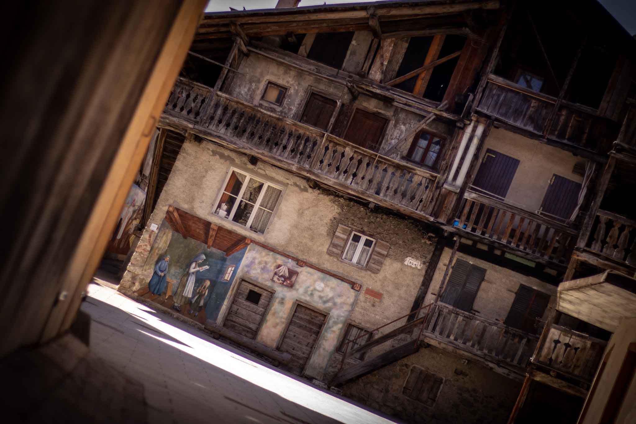 Il murales chiude scenograficamente la Piazza di Masariè, in un’ideale illusione ottica che abbraccia, attraverso il prolungamento della trave della stanza, le porte della casa su cui è stato dipinto e che ci dà l’impressione che il muro diventi trasparente per permetterci di assistere alla scena che sta avvenendo all’interno.